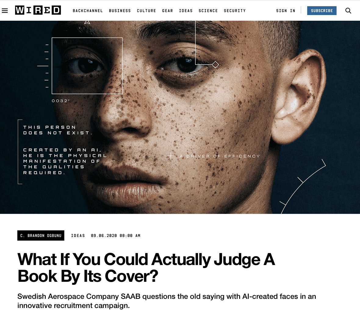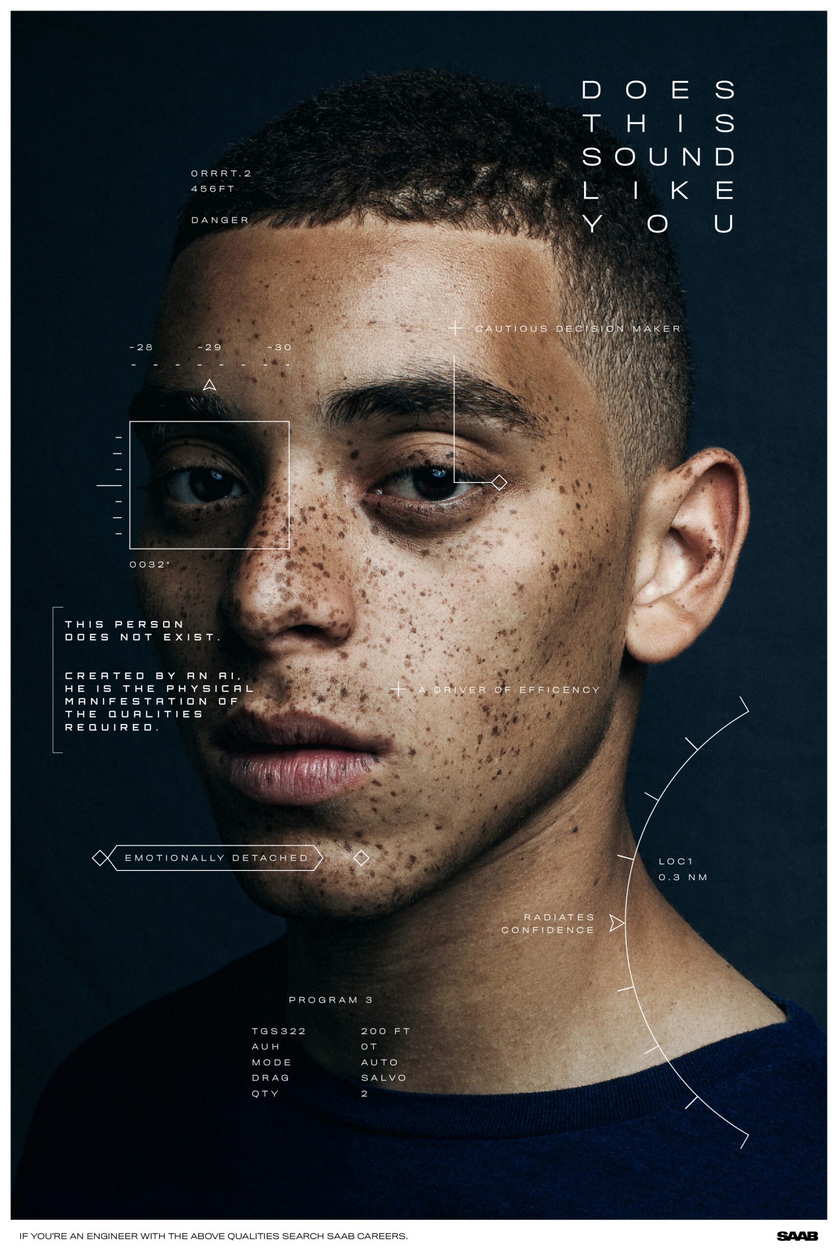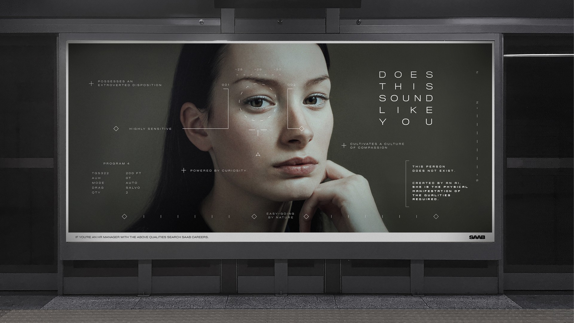 As a Swedish aerospace company, SAAB prides itself on putting innovation first. Yet when compared to big tech companies, it can lack a perceived innovative edge that attracts top talent. So instead of talking about how innovative SAAB is, we showed it, by using artificial intelligence to paint a portrait of its next candidate. Using machine learning, we trained an algorithm to reverse-engineer the face of a future hire based on the qualities they should exhibit. The result was a series of realistic composite portraits that imagined the face of SAAB’s future.